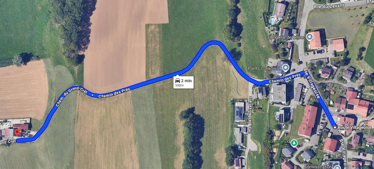 Votre GPS peut vous faire passer par le "Chemin des Près". Veuillez ne pas emprunter cette voie, c'est un chemin rural pouvant endommager votre automobile.